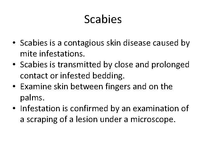 Scabies from Latin. What is a contagious skin disease transmitted by the itch mite called. Occasionally tiny burrows may appear on the skin.